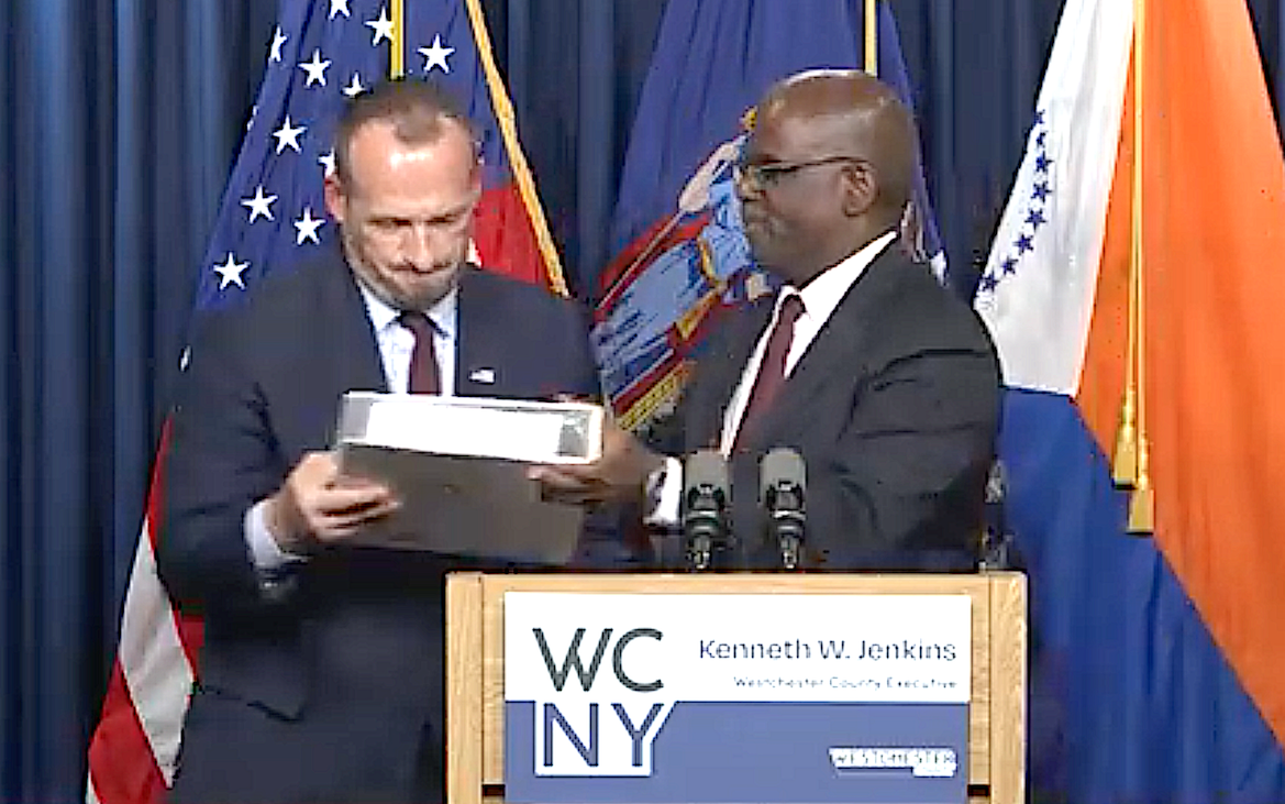 After speaking about the proposed budget at his office in the County Office building in White Plains on Nov. 7, Jenkins formally presented a budget book to Vadat Gashi, chairman of the County Board of Legislators. A final budget must be adopted by the Board no later than Dec. 27.