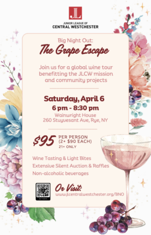 Gather with friends or enjoy a date night at BNO: The Grape Escape, an evening of wine tasting at the beautiful Wainwright House located on the Sound in Rye, NY. The event will feature a tasting of wines from around the world carefully curated by Aries Wines & Spirits. There will also be a mocktail bar and other non-alcoholic beverages. As you sip, enjoy lite bites prepared by a local culinary star, additional appetizers, and shop an extensive silent auction, including trips, restaurants, experiences and more! Find your new favorite libation and order for the season ahead while supporting a great cause! All proceeds from this 21+ event will benefit the Junior League of Central Westchester, funding the league’s mission and community projects. Since 1947, the JLCW has been making a meaningful impact in the local community. Projects in the 2023-2024 year include the Westchester County Diaper Bank, Teen Boutique, Literacy Projects with Head Start and more! Please visit our site www.jlcentralwestchester.org to learn about other important community projects.