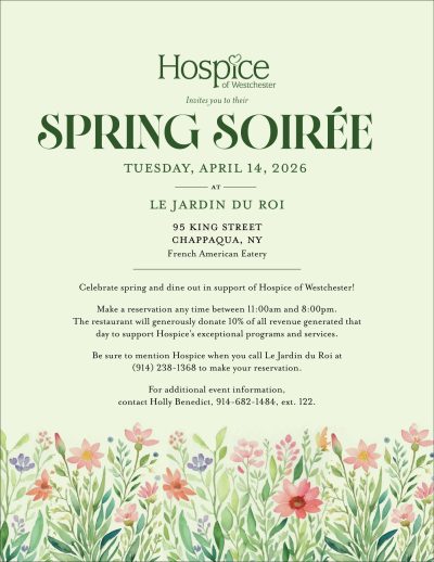 Celebrate spring and dine out in support of Hospice of Westchester (HOW) at Le Jardin du Roi on Tuesday, April 14th! As part of the organization’s Spring Soirée, the restaurant will donate 10 percent of all revenue generated that day to support HOW’s exceptional programs and services. Make a reservation any time between 11 a.m. and 8 p.m. by calling Le Jardin du Roi at (914) 238-1368, and remember to mention ‘Hospice’. For more information about the event, contact Holly Benedict at (914) 682-1484, extension 122.