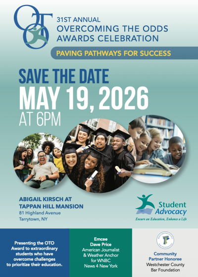 Student Advocacy, Inc. will host its 31st Annual Overcoming the Odds Awards Celebration on Tuesday, May 19 at Tappan Hill Mansion in Tarrytown, bringing together educators, community leaders, and local advocates for an evening centered on resilience, access, and achievement.