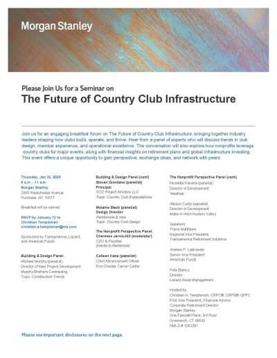 The conversation will also explore how nonprofits leverage country clubs for major events, along with financial insights on retirement plans and global infrastructure investing. For those who would like to attend, please RSVP by January 12th to Christian Templeman at christian.a.templeman@ms.com