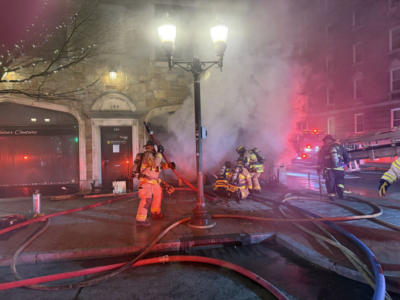 Eight engines and three ladder trucks responded to the fire at 188 Bedford St. at 4:50 a.m. where some of the 52 firefighters and emergency personnel discovered smoke coming from the first floor of Chez Vous Bistro Restaurant. The 60-foot by 80-foott, two-story commercial building also houses Whim Womens Clothing (168 Bedford St., 1st floor); Atelier Valoar Couture clothing (180 Bedford St., 1st floor); Women’s Business Development Council (184 Bedford St., 2nd floor); and Deco Fine Arts and Framing (33 Spring Street, 1st floor).