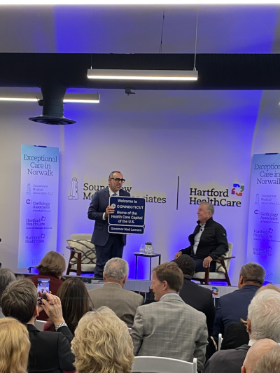 Flaks, president and CEO of Hartford HealthCare (HHC) made his pitch to the governor in person Nov. 7 at the grand opening of HHC’s new Norwalk HealthCenter in the former Lillian August furniture showroom at 32 Knight St. He held up a blue sign emblazoned with the words, “Welcome to CONNECTICUT. Home of the Health Care Capital of the U.S.”