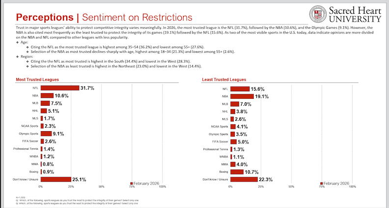 FAIRFIELD — A new national poll from Sacred Heart University and GreatBlue Research finds that public trust in professional sports leagues varies widely, with the NFL viewed as the most trusted league to protect the integrity of its games.